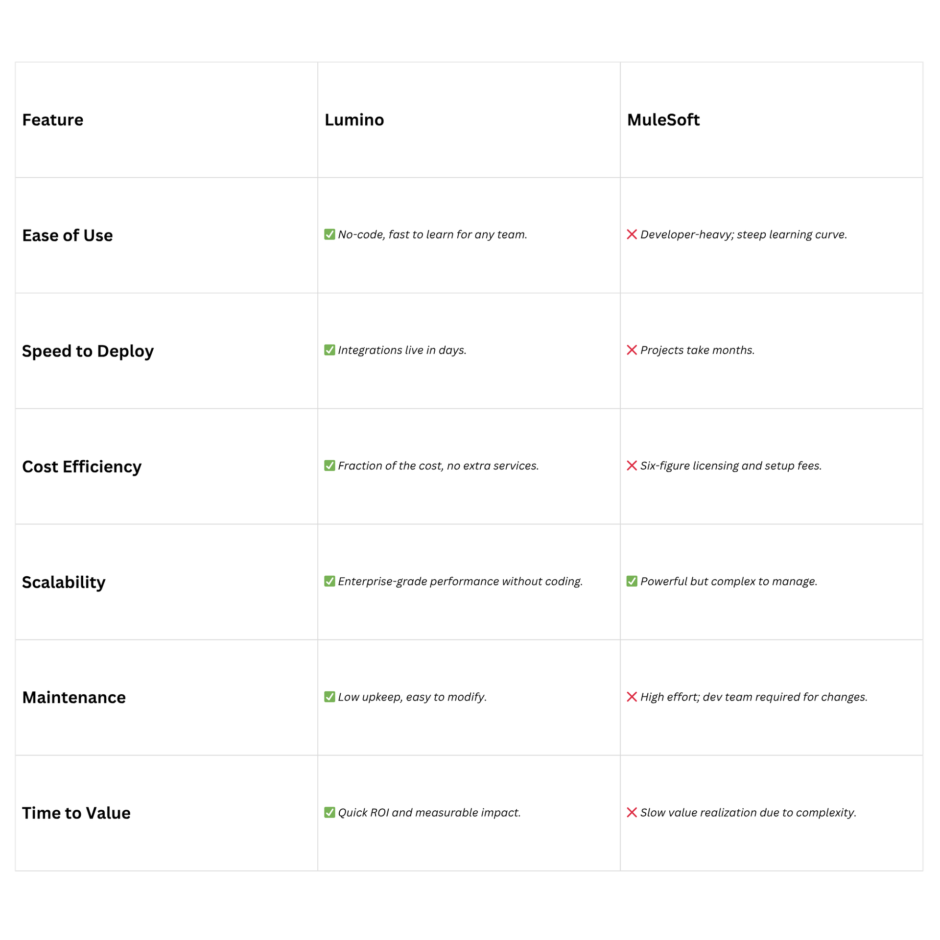 MuleSoft is powerful, but it’s also complex, expensive, and slow to deliver results. Lumino gives teams the same integration impact - faster, simpler, and at a fraction of the cost.