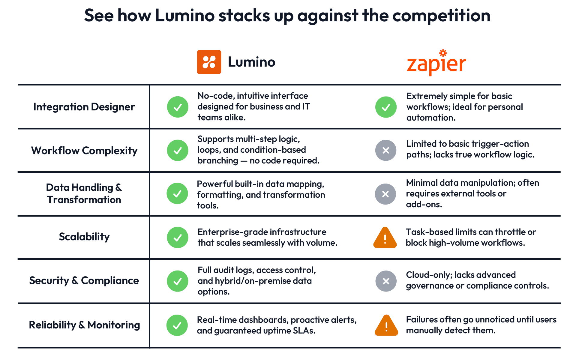 Lumino picks up where Zapier leaves off — giving organizations the power, control, and reliability to scale their integrations without sacrificing ease of use. Whether you’re connecting departments, syncing systems, or orchestrating high-volume data flows, Lumino provides the structure and stability Zapier can’t.